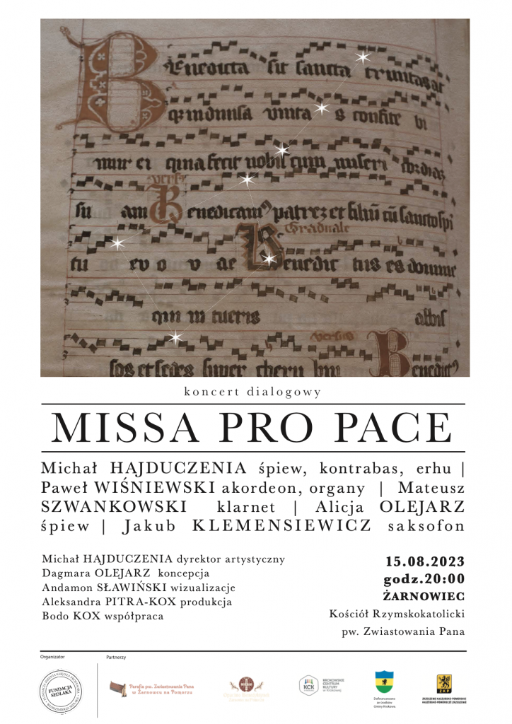Koncert Missa pro pace to koncert dialogowy na organy i saksofon, kontrabas, klarnet, erhu i śpiew – zaaranżowany w oparciu o XV-wieczny rękopis cysterski, tzw. Graduał Żarnowiecki. Twórcza interpretacja sakralnych motywów muzycznych z XV wieku tworzy nowatorską ofertę muzyczną, kultywuje tradycję i najwybitniejsze osiągnięcia wielowiekowego dziedzictwa kultury polskiej. Przetworzenie istniejących w kulturze lokalnej wątków, przy połączeniu tradycji i nowoczesności jest poszukiwaniem innowacyjnych rozwiązań artystycznych.Tytuł wydarzenia Missa pro pace (tł. msza o pokój) nawiązuje do pierwszego zdania księgi cysterskich rękopisów z XV wieku, będących własnością skarbca klasztoru benedyktynek w Żarnowcu. Materiał źródłowy jest inspiracją i podstawą działania artystycznego.